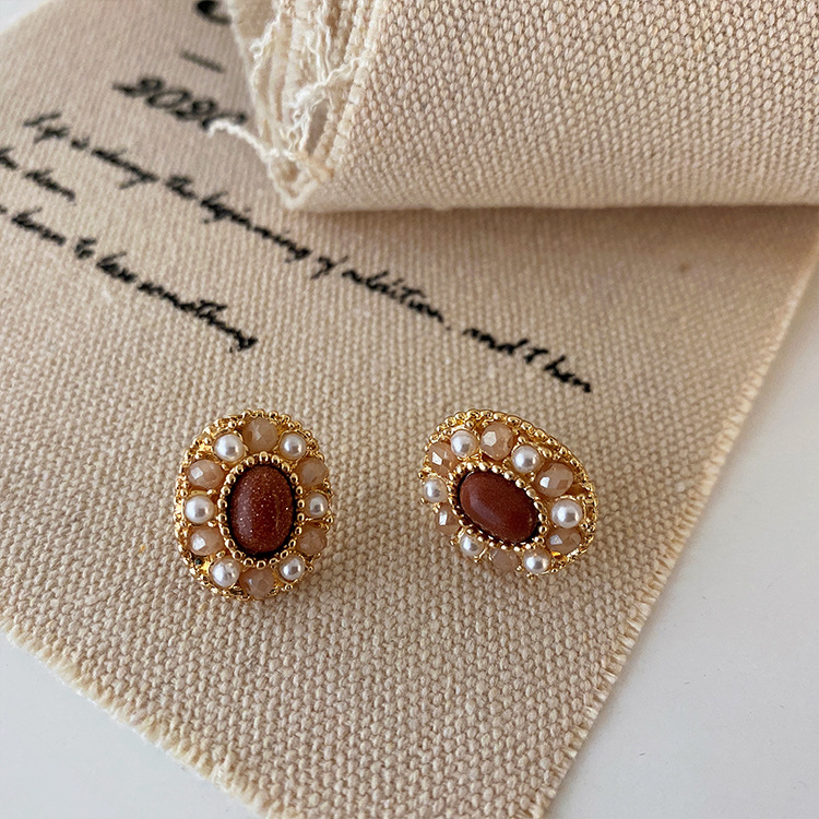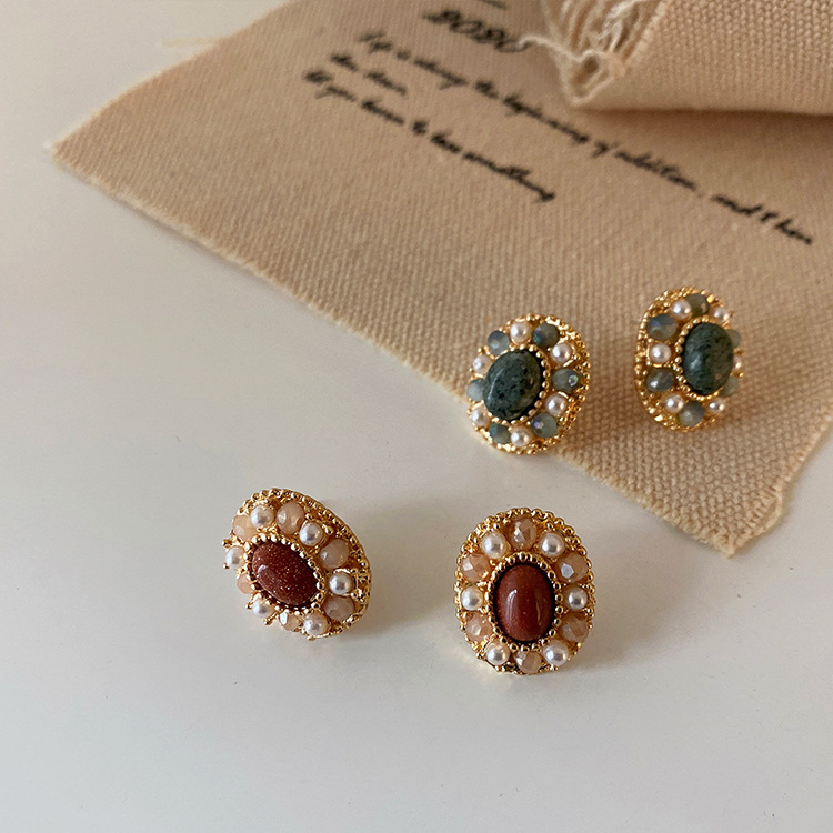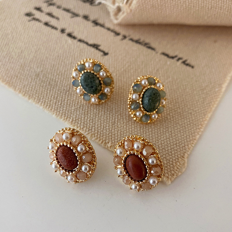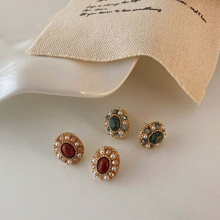 These earrings feature a retro design with a geometric shape, made from natural French stone and adorned with crystal pearls. The electroplating process ensures a high-quality finish. Note that as handmade products, some earrings may have slight variations.