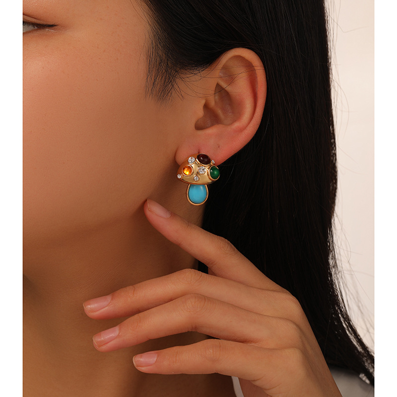 Crafted from a blend of materials, these earrings feature a unique, geometric design. Utilizing advanced electroplating technology, each piece weighs approximately 6.7g, and has a size of around 2.5cm in length and 2cm in width. Discover the perfect balance of style and quality with our Retro Turquoise Mushroom Color Gemstone Earrings. These earrings are not only eye-catching but also durable, making them a staple in your jewelry collection..