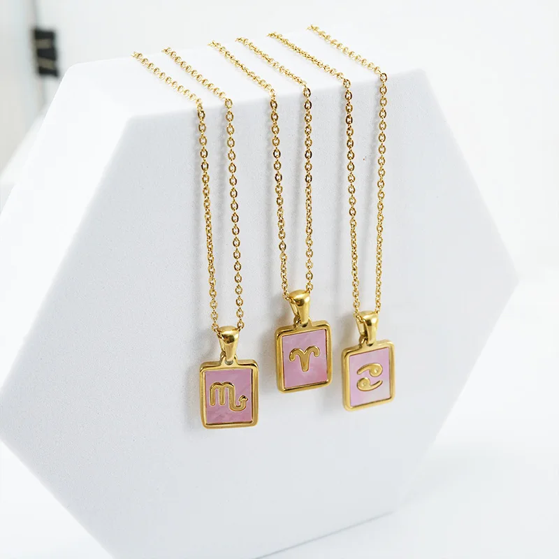 This beautiful necklace is crafted from 18K gold-plated stainless steel and is adorned with a pink shell in the shape of your zodiac sign. A timeless statement piece, you'll be sure to sparkle and shine! This necklace is the perfect way to show off your individual astrological sign in a fashionable way. An eye-catching accessory that is designed to last and will always be in style.